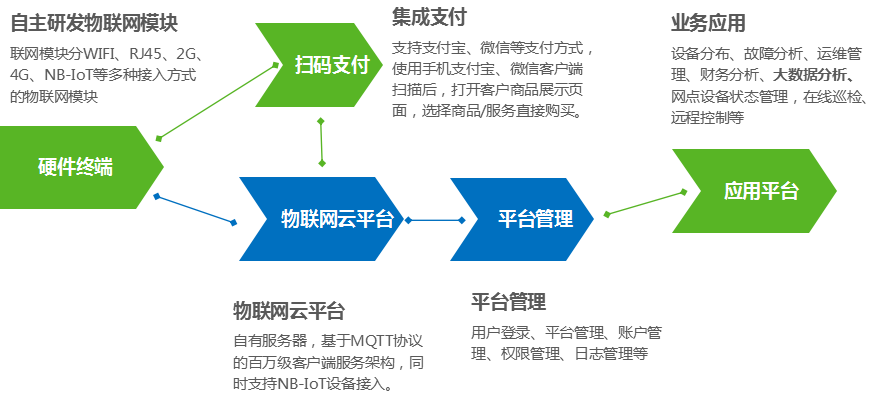 设备分布、故障分析、运维管理、财务分析、大数据分析、网点设备状态管理,在线巡检、远程控制等